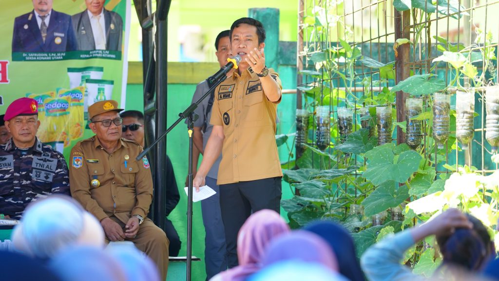 aspirasirakyatsultra.com | Konut - Bupati Konawe Utara, H. Ikbar, S.H., M.H., bersama Wakil Bupati H. Abuhaera, S.Sos., M.Si., menghadiri kegiatan Gerakan Pangan Murah (GPM) dalam rangka stabilisasi pasokan dan harga pangan di Kabupaten Konawe Utara. Kegiatan ini digelar di halaman Kantor Dinas Ketahanan Pangan, Rabu (04/11/2025).