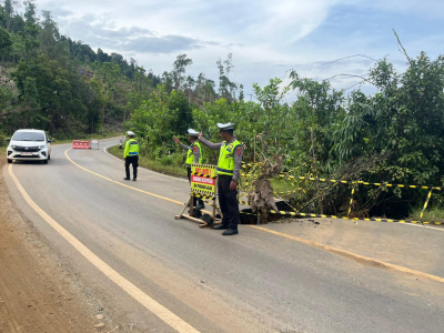 Kegiatan patroli yang dilaksanakan sejak pukul 13.00 WITA tersebut menemukan kondisi badan jalan yang mengalami kerusakan cukup signifikan akibat longsor, sehingga berpotensi membahayakan pengguna jalan yang melintas di jalur utama tersebut.
