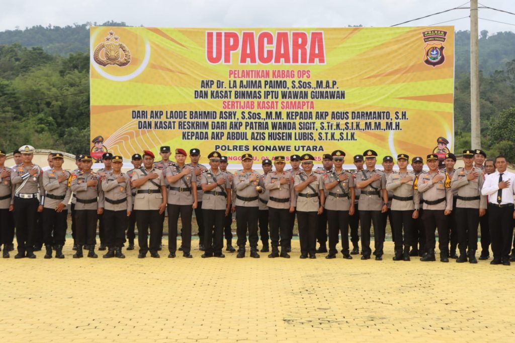 aspirasirakyatsultra.com | Konawe Utara — Kepala Kepolisian Resor (Kapolres) AKBP Rico Fernanda, S.H., S.I.K., M.H memimpin upacara pelantikan dan serah terima jabatan (sertijab) pejabat utama (PJU) Polres Konawe utara, Senin (04/08/25) Upacara pelantikan dan serah terimah jabatan bertempat dilapangan apel Mapolres Konawe utara Kelurahan Wanggudu Kecamatan Asera Kabupaten Konawe utara dihadiri Ketua Bhayangkari Cabang Ny. […]